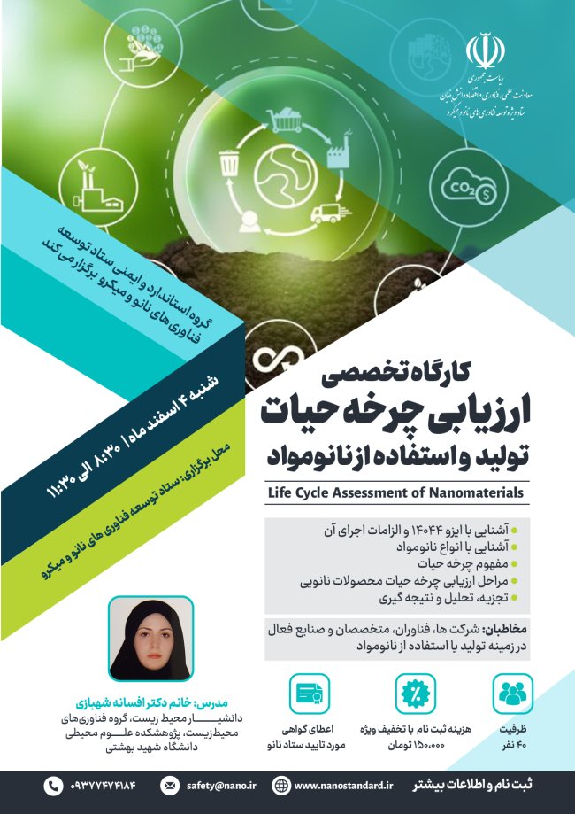 به دلیل اهمیت این موضوع، گروه استاندارد و ایمنی ستاد توسعه فناوری نانو کارگاه تخصصی "ارزیابی چرخه حیات تولید و استفاده از نانومواد" را برای آشنایی شرکتها و صنایع مرتبط برگزار مینماید.
